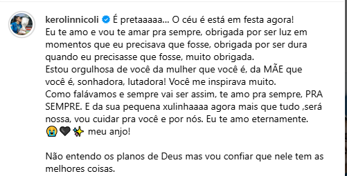 "Estou orgulhosa de você, da mulher que você é, da MÃE que você é, sonhadora, lutadora! Você me inspirava muito. Como falávamos e sempre vai ser assim, te amo pra sempre, PRA SEMPRE. E da sua pequena xulinhaaaa agora mais que tudo, será nossa, vou cuidar pra você e por nós. Eu te amo eternamente. Não entendo os planos de Deus, mas vou confiar que nele tem as melhores coisas".