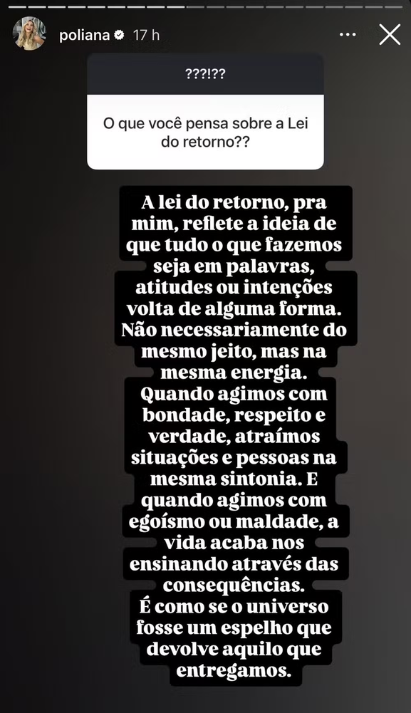 “A lei do retorno, para mim, reflete a ideia de que tudo o que fazemos — seja em palavras, atitudes ou intenções — volta de alguma forma. Não necessariamente do mesmo jeito, mas na mesma energia. Quando agimos com verdade, atraímos situações e pessoas na mesma sintonia. E, quando agimos com egoísmo ou maldade, a vida acaba nos ensinando através das consequências. É como se o universo fosse um espelho que devolve aquilo que entregamos”, refletiu Poliana.